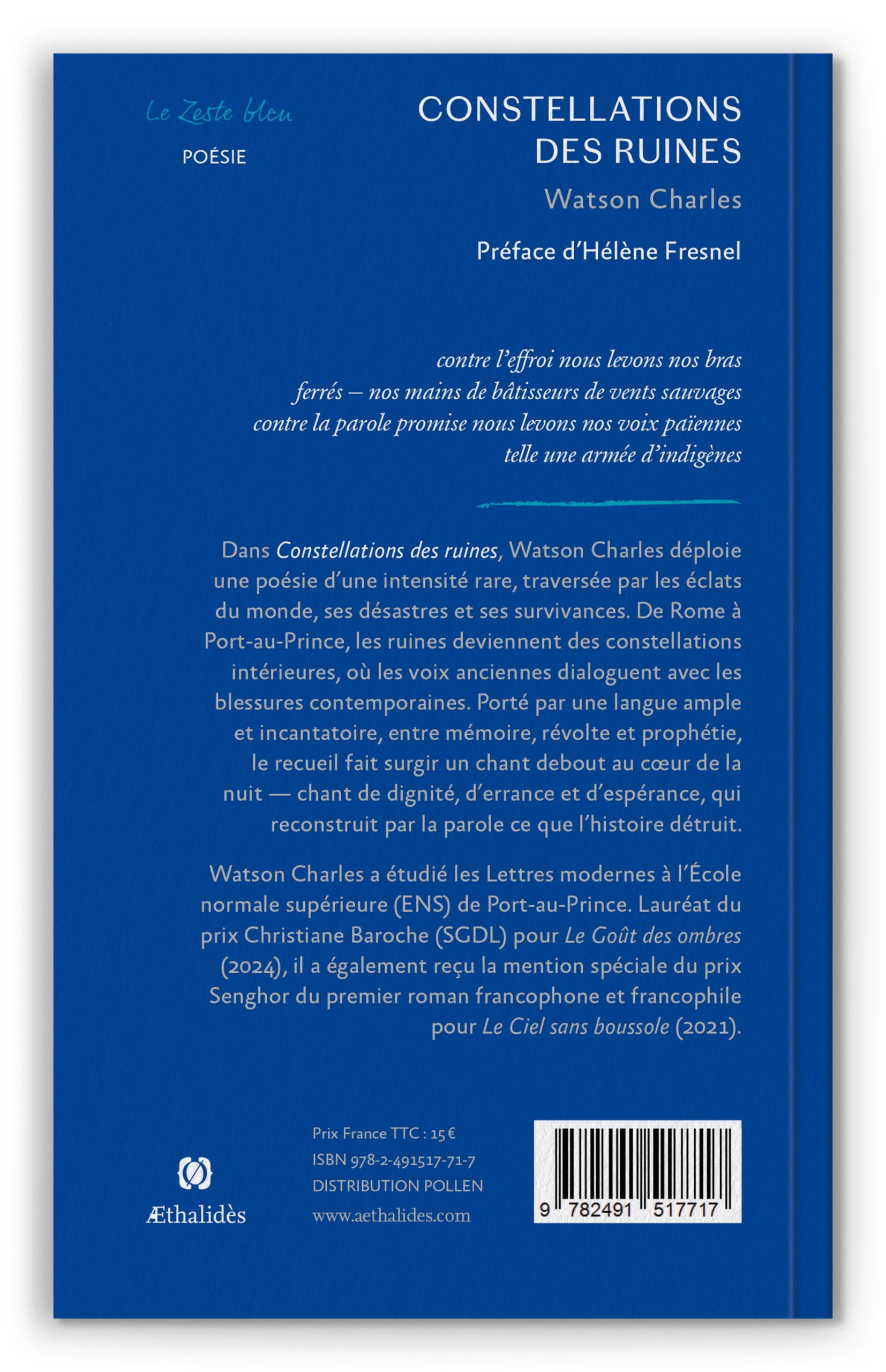 Edition brochée de Constellations des ruines, recueil de poésie de Watson Charles, éditions Æthalidès, Collection « Le zeste bleu ».