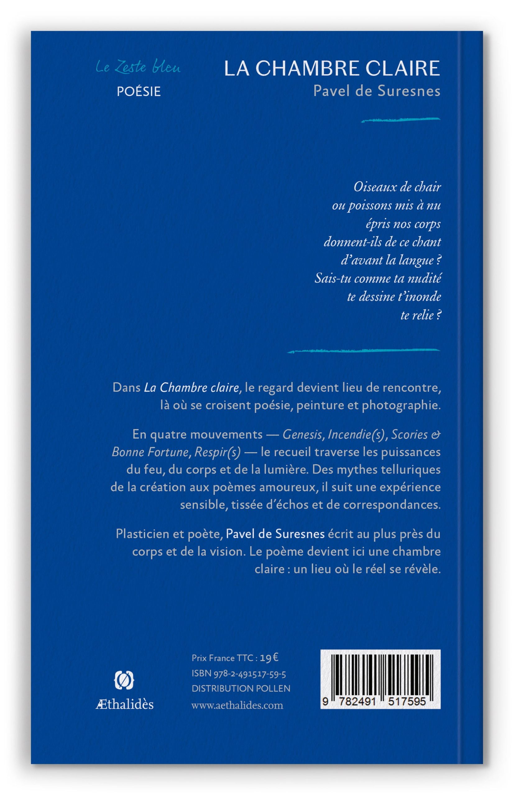 Edition brochée de La Chambre claire, recueil de poésie de Pavel de Suresnes, éditions Æthalidès, Collection « Le zeste bleu ».