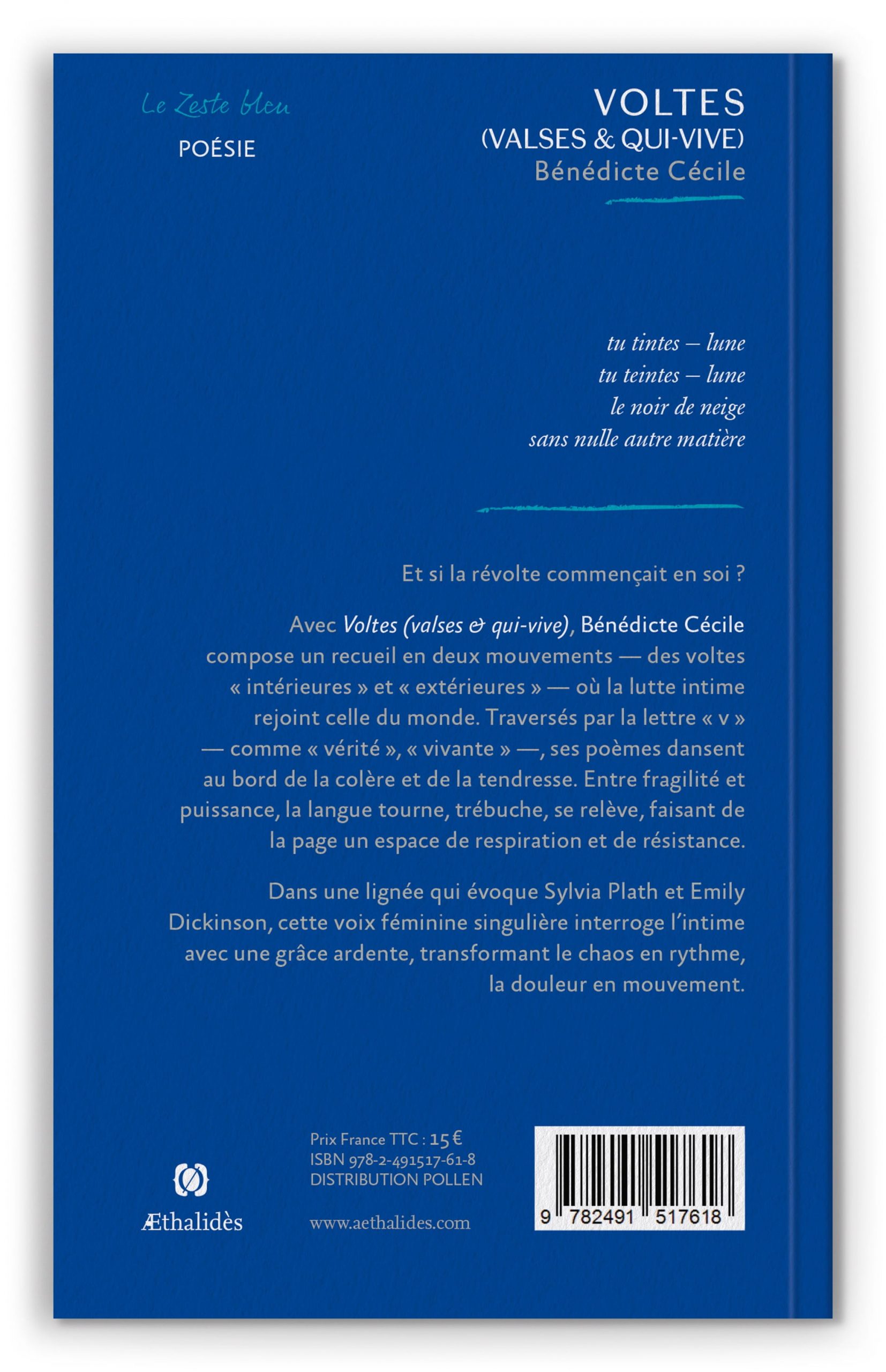 Edition brochée de Voltes (Valses & Qui-vive), recueil de poésie de Bénédicte Cécile, éditions Æthalidès, Collection « Le zeste bleu ».