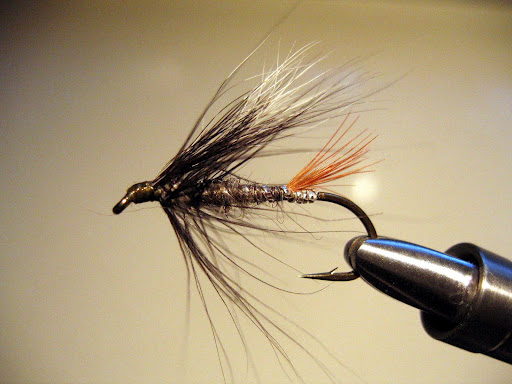 On est dans l’eau jusqu’à mi-cuisses, je retrouve progressivement la mémoire de la main. J’ai choisi une Blue Dun, fort du principe maintes fois éprouvé que la Blue Dun est l’ancre de salut du pécheur à la mouche noyée sur une eau qu’il ne connait pas. Ma Blue Dun plonge en douceur sous le poids de la vaseline, puis je remonte tranquillement, je fouette à nouveau, je recommence. Je ne sais pas avec quelle mouche pêche Pete, et quand je le lui demande il répond en souriant que c’en est une de son cru, la « Special Pete N° 5» dit-il, un truc brun et savamment ébouriffé.